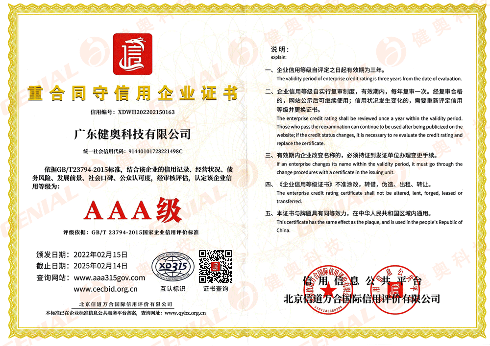 2022年2月,健奧科技被評(píng)為企業(yè)信用評(píng)價(jià)AAA級(jí)信用企業(yè),標(biāo)志著公司企業(yè)信用建設(shè)再上新的臺(tái)階??!
